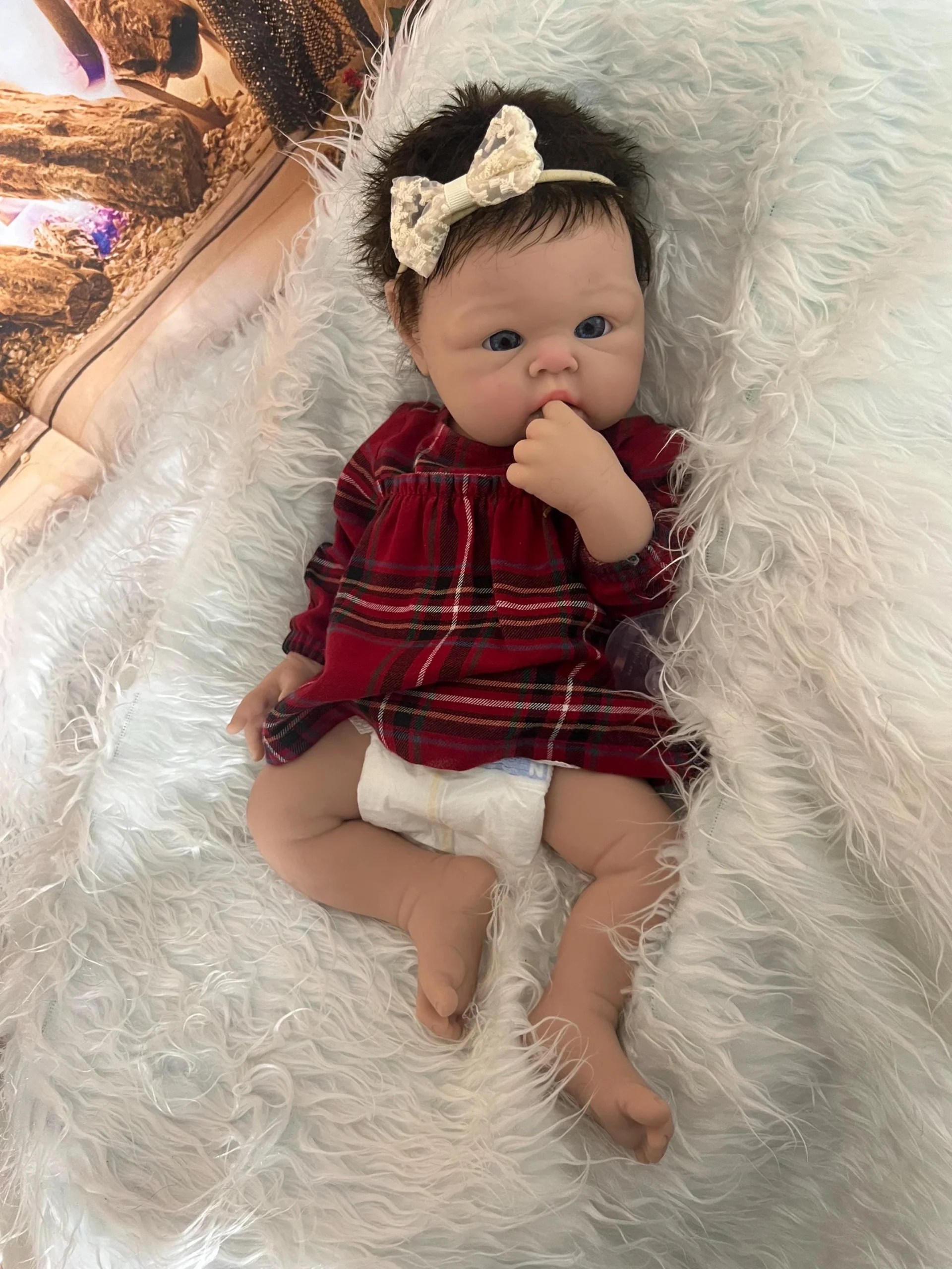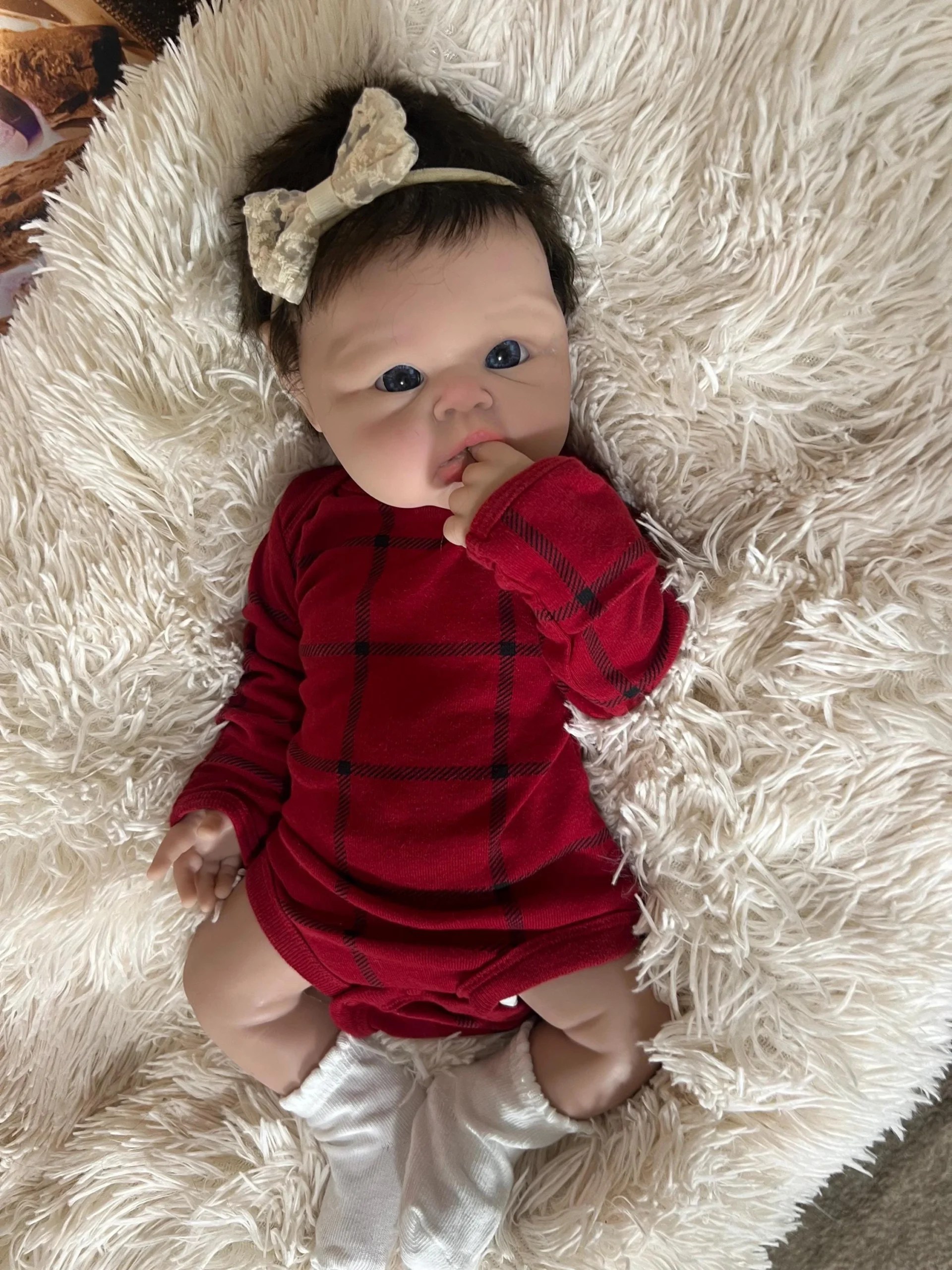 The baby doll measures approximately 18-19 inches and fits into newborn-sized clothing and diapers. Its mouth has been modified to take a regular pacifier, which enhances the realistic feeling of holding her. The dolls are soft and floppy, contributing to their lifelike quality. However, caution is advised as the paint may wear off if submerged in water. Due to the very soft silicone's delicate nature, which is prone to tears, this product is not recommended for children under 16.